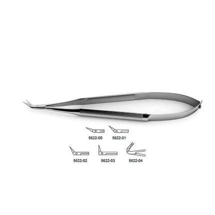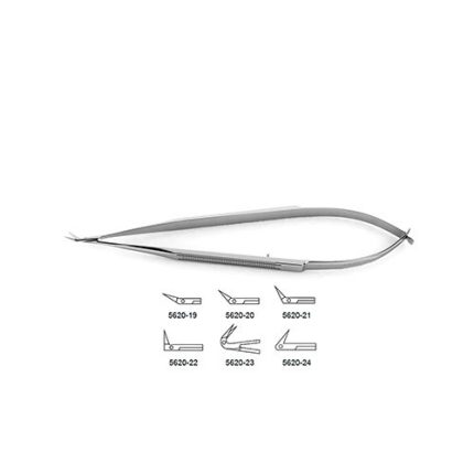 Jacobson Micro scissors are ideal for procedures where delicate tissue below the incision should not be aggravated. These scissors offer a flat handle, for stability, as well as a probe tip on one blade to avoid accidental puncturing or aggravation of tissue. Numerous angle settings for the blade are offered to accommodate various procedures. These scissors are made of operating room grade stainless steel, and are manufactured to the highest standard of instrumentation by expert craftsmen in Germany.