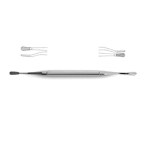 double-ended, cross-cut, 7" (18.0 cm) Bone File is a highly versatile instrument that can be used in a vast array of surgical procedures. This file is double ended and is cross cut. The small paddle style blades allow it to be used near delicate tissue areas as are common in neurosurgical procedures and not cause trauma or injury by puncture wound. Additionally use of this file on jagged bone breaks or cuts or even on rough hard surfaces aids in the protected of neurovascular bundles and other tissue layers that are mobilized during surgery that can easily be torn or injured.