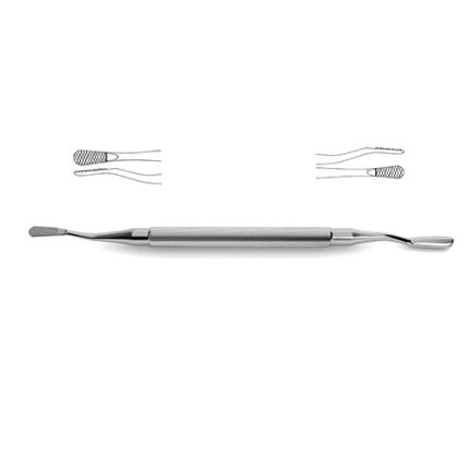 flat blades, double-ended flat blades, 18.0 mm width tapers to 4.0 mm, 1 end curved up, 1 end curved sideways, 10-1/2" (26.5 cm)Putti Bone Rasp is an instrument ideally suited for use in surgeries that require handling and particularly mild reshaping of bone such as in neurosurgical or orthopedic surgeries. . This instrument is double ended and features two flat blades. The unique design of this rasp is in the leap shaped silhouette that tapers from 18.00 mm to 4.0 mm that allows it to be fit into slim and narrow spaces and effectively whittle down bone or hard tissue from any angle.