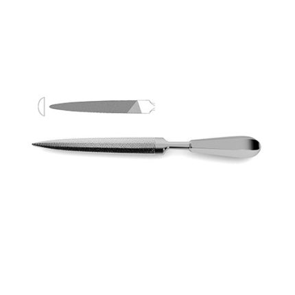 single-ended, 2-sided convex & flat blade, 23.0 mm width tapers to 6.0 mm, 11" (28.0 cm) Bone File is a ideally suited for many different surgical procedures. It is specifically designed to be used to file away at bone fragments that are caused by breaks or cuts or on coarse hard tissues in different parts of the body. They can be especially useful in neurosurgical and orthopedic procedures that can involve maneuvering and exploring around many different bony areas such as the skull, long bones and vertebral column. Additionally this file is single sided with a convex and flat blade and a 23.0 mm width that tapers to 6.0 mm.