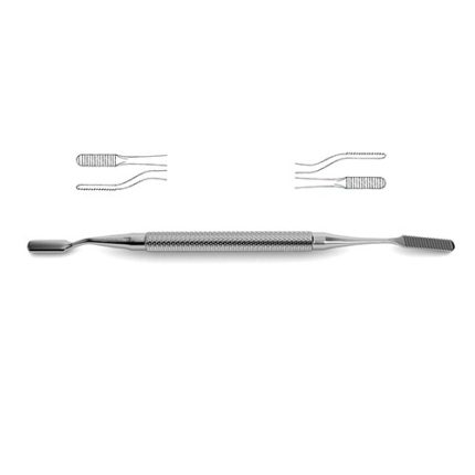 double-ended, cross-cut, 7" (18.0 cm) Bone File is a highly versatile instrument that can be used in a vast array of surgical procedures. This file is double ended and is cross cut. The small paddle style blades allow it to be used near delicate tissue areas as are common in neurosurgical procedures and not cause trauma or injury by puncture wound. Additionally use of this file on jagged bone breaks or cuts or even on rough hard surfaces aids in the protected of neurovascular bundles and other tissue layers that are mobilized during surgery that can easily be torn or injured.