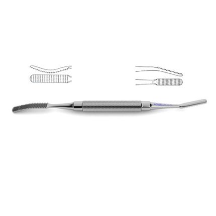 bayonet, 1 side flat & 1 side convex w/ cross-serrations, 9-1/2" (24.0 cm)Bone Rasp is designed to aid in manipulation of bone and other hard tissue surfaces. It can be used to scrape or file away at these surfaces to give them a smoother finish for a variety of reasons. Mainly it is well suited for use in neurosurgical or orthopedic surgeries because these coarse bony areas can cause damage to surrounding tissue if they are not evened out with a file or raspatory. This rasp is a bayonet style and features one flat size and one convex side with cross-serrations that makes it well suited for filing.