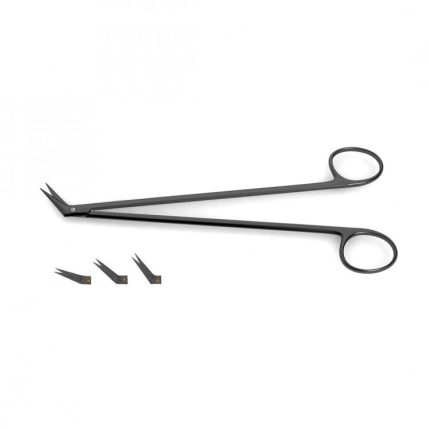 (tungsten carbide blades w/ 1 micro serrated blade), 7-1/8" (18.1 cm) Ceramic Cut Hegemann Dietrich Vascular Scissors have a very delicate pattern for fine procedures. The Tungsten Carbide blades are available 25, 45, 60 and 90 degree angles to suit the cardiovascular procedure at hand. This 18.1 cm long instrument is coated in a black ceramic that reduces glare and increases the durability of the instrument. Ceramic cut scissors are the highest-performing line of scissors MEDIZINISCH IMPEX offers. These scissors, combine the performance and precision of supercut with the durability of tungsten carbide cutting edges. In addition, the entire instrument is coated with a black ceramic finish which provides the highest surface hardness of all scissor models and results in a supremely durable instrument. The black ceramic coating is designed to reduce the friction between metal surfaces and provide surgeons with a smooth, steady cutting action. The black finish also reduces glare under operating room lights.